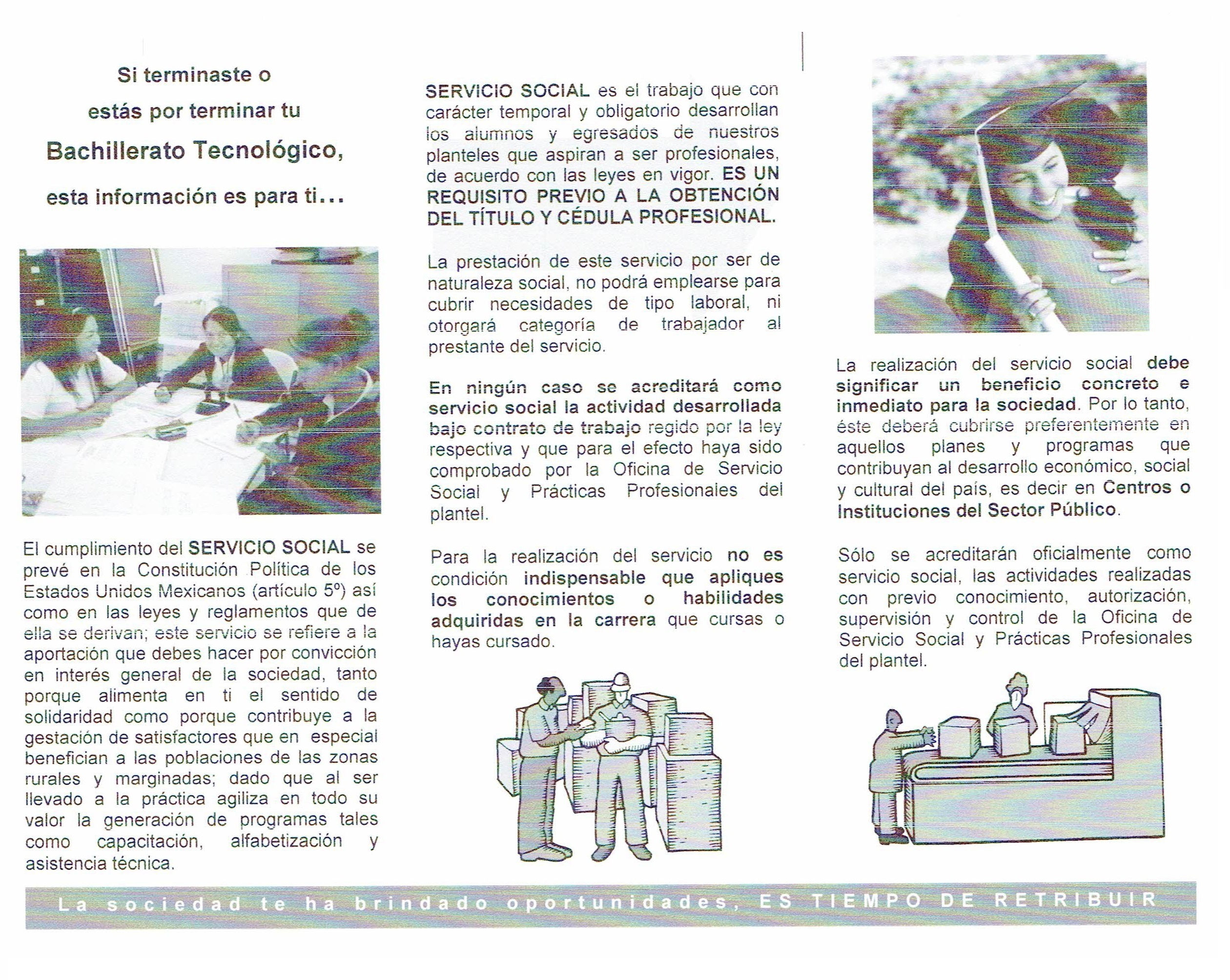 El cumplimiento de servicio social se prevé en la constitución política de los estados unidos mexicanos, así como en las leyes que de ella se derivan. Este servicio se refiere a la aportación que debe hacerse por convicción en interés general de la sociedad, tanto porque aumenta en el prestador su sentido de solidaridad porque contribuye a la gestación de satisfactores que en especial benefician a las poblaciones de las zonas rurales y marginadas; Dado que al ser llevado a la práctica agiliza en todo su valor la generación, de programas tales como capacitación alfabetización y asistencia técnica. Es además un requisito previo a la obtención de un título profesional.